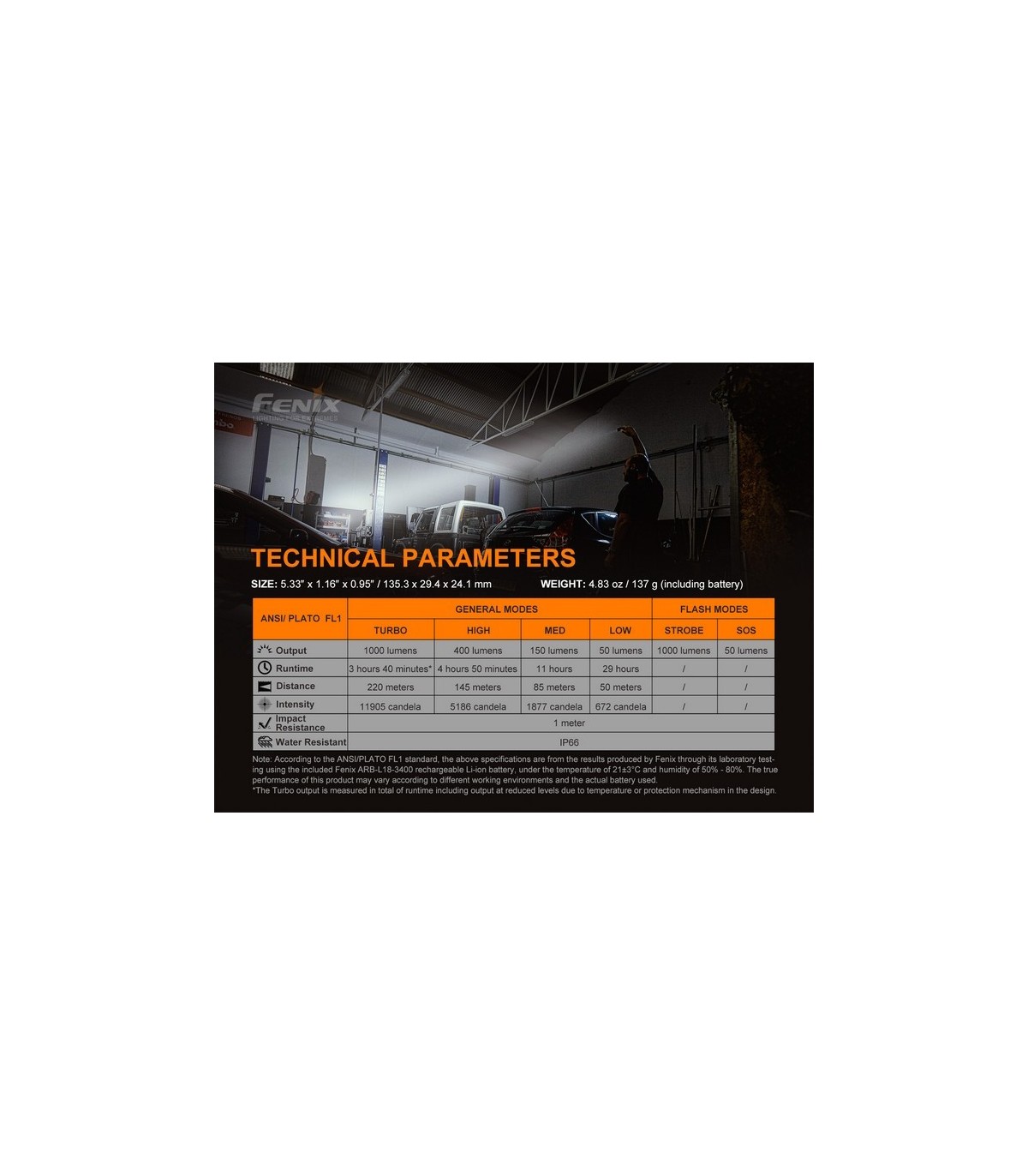 - Salida máxima de 1000 lúmenes y distancia máxima de haz de 220 metros.